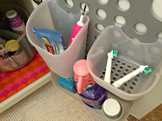 I next took the hang-it to my girls bathroom to see if it could tackle the job of organizing their hair accessories. Headbands in the bottom, washcloths in the top, this could be a match made in heaven. But then I put the toothbrush heads into one of the containers and then it dawned on me....