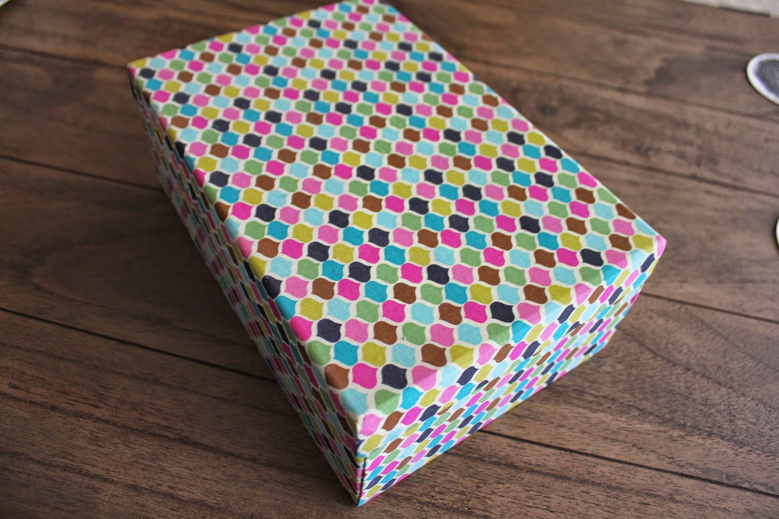 Lastly I decided to use a box I covered in fabric to store labels, scissors, tape, etc for gift wrapping, as it was the perfect size to fit on the only shelf in my laundry closet.