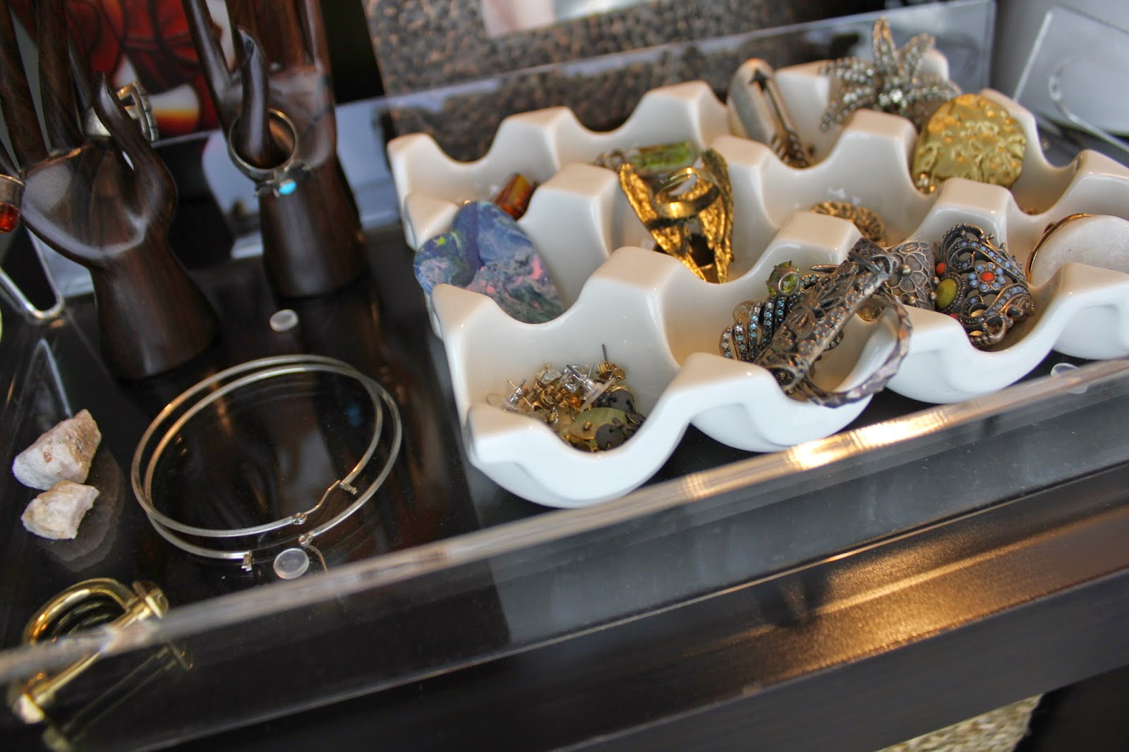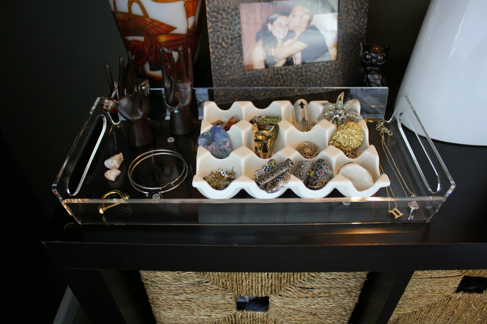 And last but not least, were my rings. How could I get all of those gems onto the wall display? At first I thought I might use a thread rack. After a beautiful coat of colorful spray paint it would be perfect. And then I thought about the location of the jewelry, inside the entrance to my bedroom. And then I imagined someone getting serious injured on said thread rack, so I quickly scratched that idea. I went with my second option, a ceramic egg crate (already had on hand) to hold all of my rings and a fab acrylic tray ($15 from Home Goods) for extras bits and fun!