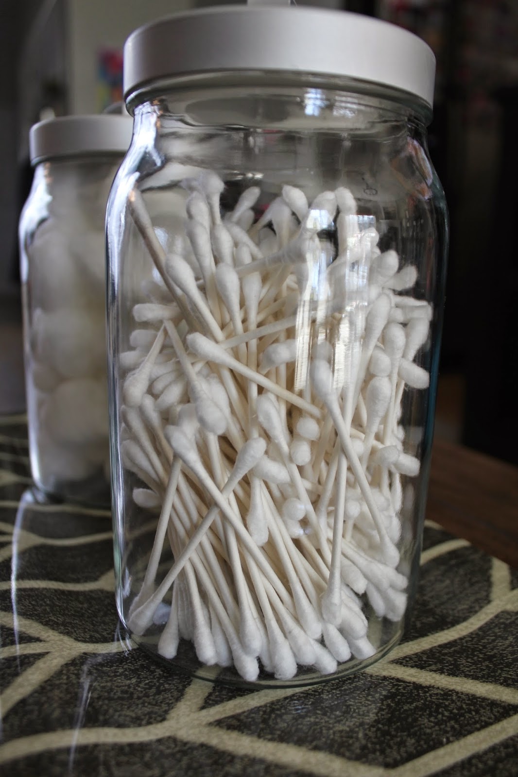I also decanted my qtips, cotton balls, and cough drops. I love look of the glass jars versus the unattractive retail packaging.