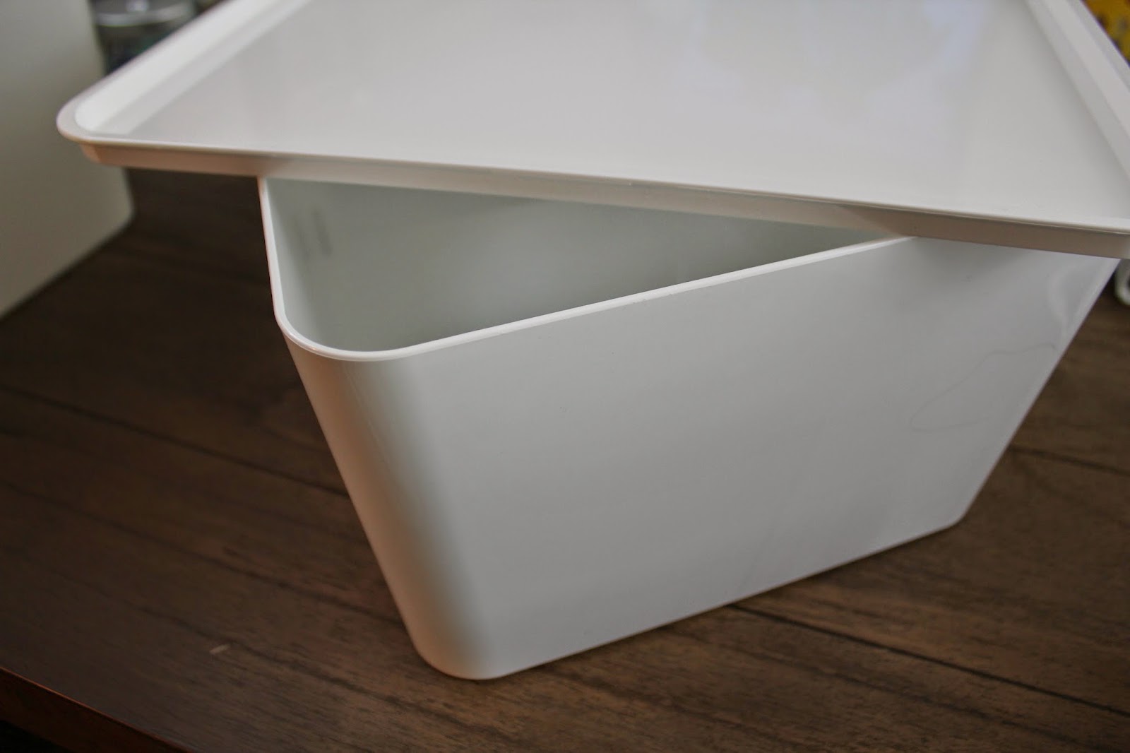 I knew I wanted baskets, but felt as if they would need lids, as the piles of items seemed distracting. The construction of a lid would also allow stacking of the baskets, which would free up space to add our extra bathroom towels. I had a few options to choose from at home, but felt that the appearance of these baskets were dark in color for such a small space. I wanted something to pop. So off I went to Ikea with high hopes of finding the perfect (and inexpensive) solution to my problem. And that I did!