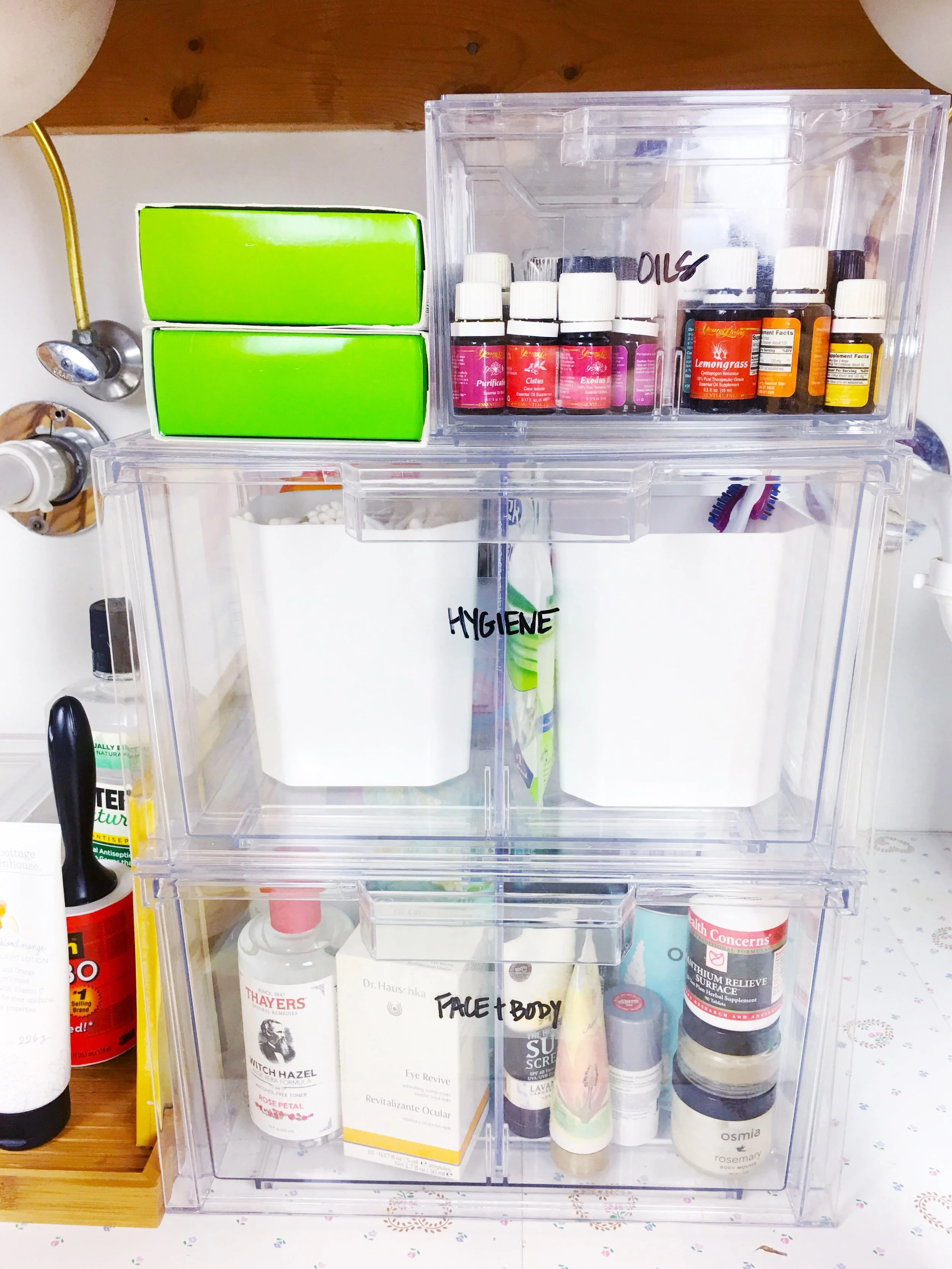As with all projects, we started by taking everything out and grouping like products to decide on categories and placement. Once this stage was completed, we decided on the following categories: hygiene, perfume, oils, face & body, hair tools, and feminine. Easy to find, easy to replenish once the supply of a particular item runs low, and by using the sweater drawers, it limits the amount of product that one person can have on hand. There is nothing better than good balance between needs and wants.
