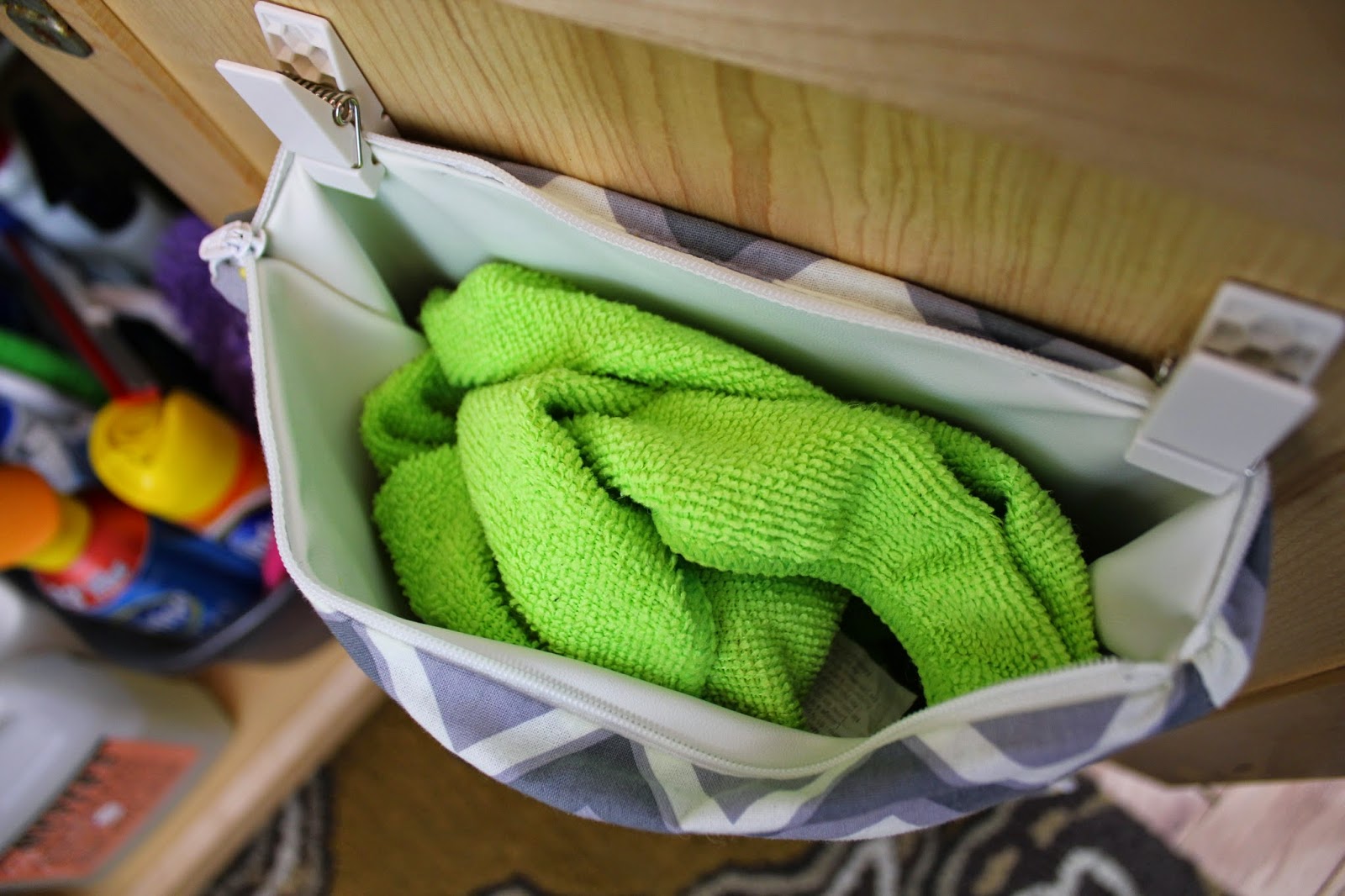 And just like that, my question of how to store said cleaning cloths was answered while checking Pinterest one day. Jen over at iheartorganizing came up with a magical solution that I knew would work like a charm. A wet bag designed with small children in mind, useful for wet clothes when accidents strike. This would be fantastic for housing these dirty clothes. And the icing on the cake, it's machine washable! No need to rummage through the bag, as it goes into the wash as well. Lifesaver? Yep, it sure is!